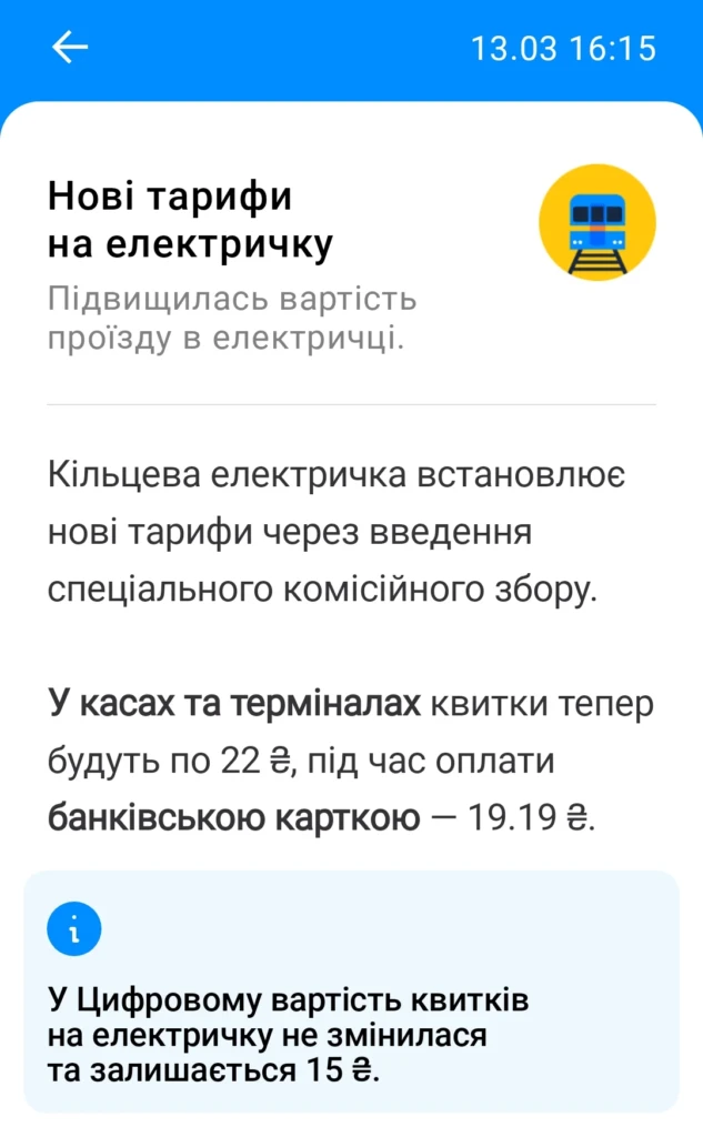 - 15,00 грн при оплаті за допомогою Київ.Цифровий та мобільного застосунку Укрзалізниці;