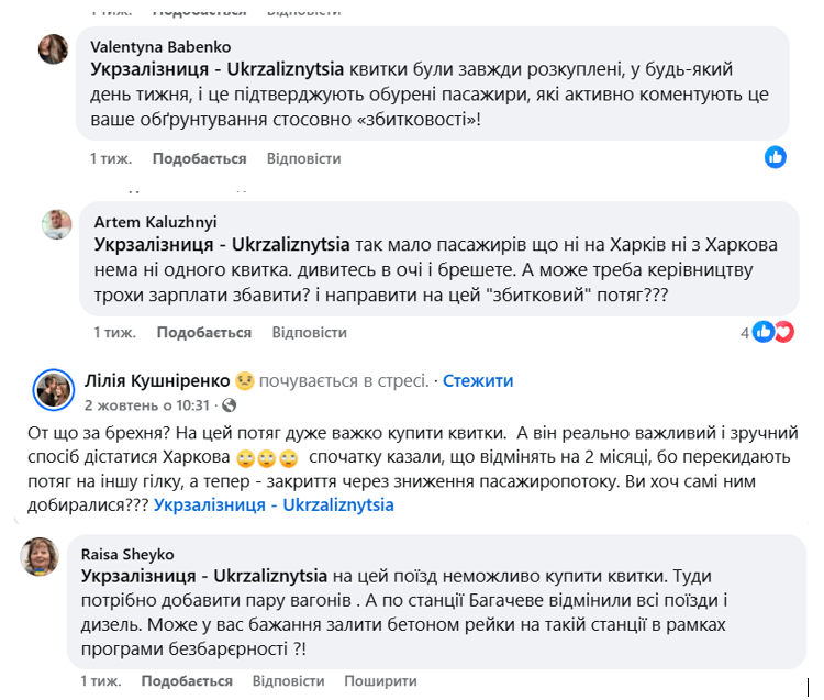 Із заявленою перевізником причиною у зниженні пасажиропотоку користувачі мережі Facebook не погоджуються, адже придбати квитки на дані поїзди було складно через їх постійну відсутність.