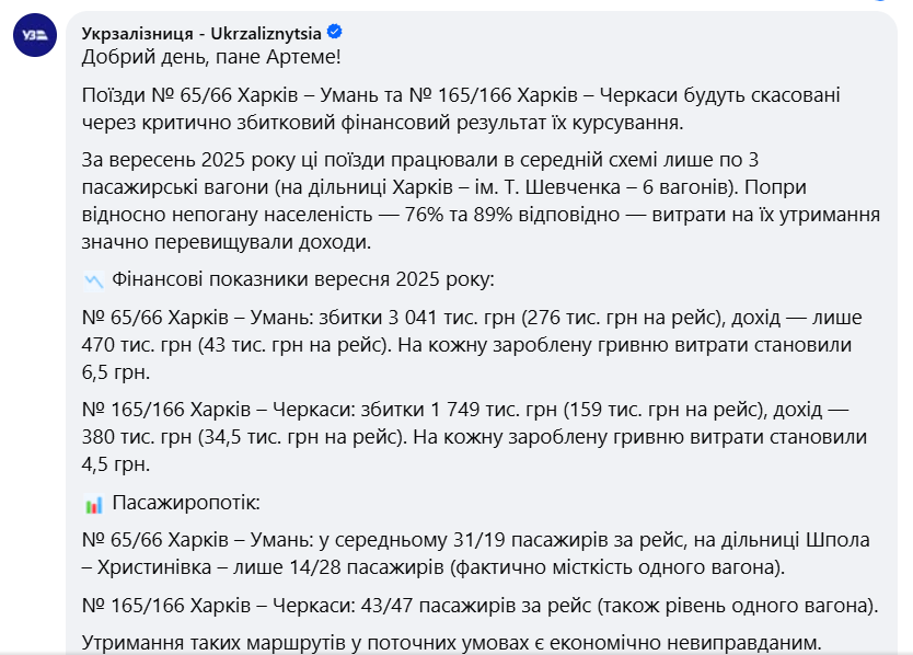 З 08 жовтня 2025 року курсування нічного швидкого поїзда №65/66 Харків-Умань та №165/166 Харків-Черкаси відмінено.