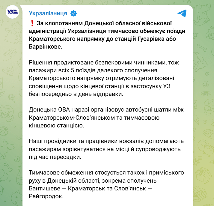«Важке, але важливе рішення заради збереження життів прийняли спільно з Укрзалізницею – тимчасово обмежуємо рух поїздів Краматорського напрямку до меж Харківської області. Рішення продиктоване безпековими чинниками, тож пасажири всіх 5 поїздів далекого сполучення Краматорського напрямку отримують деталізовані сповіщення щодо кінцевої станції в застосунку УЗ безпосередньо в день відправки»,